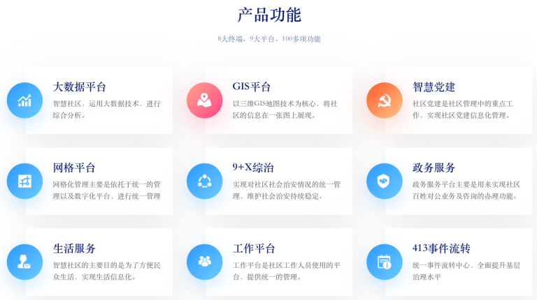 服务项目 > 智慧社区 多种应用场景、灵活选择生活中见证科技的力量! 功能更全的智慧社区 中国软件行业优秀软件产品,以各地社区/政府需求为出发点,8大终端,9大平台,100多项功能,标准+定制为您打造专属的智慧社区平台!